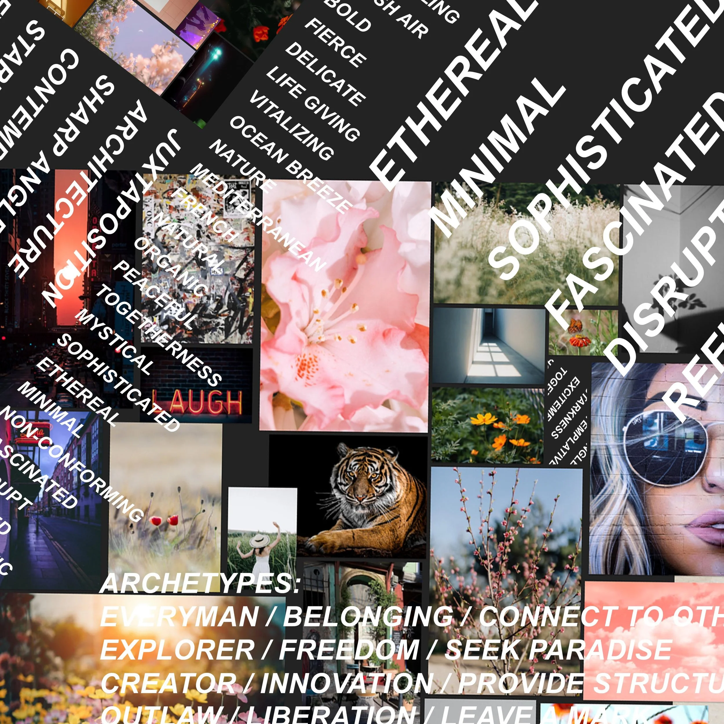 Once we’ve created a solid mood board, we move on to descriptors and archetypes. This is the non-visual part of the process — and it is a process. It’s a deep dive into every sensory experience that each image evokes. In other words, it’s words, words, words. Lists, groups, ideas, notes — all get culled to a clean and meaningful list of words to describe the brand. From there, I establish an initial brand archetype selection of the top four or five types.